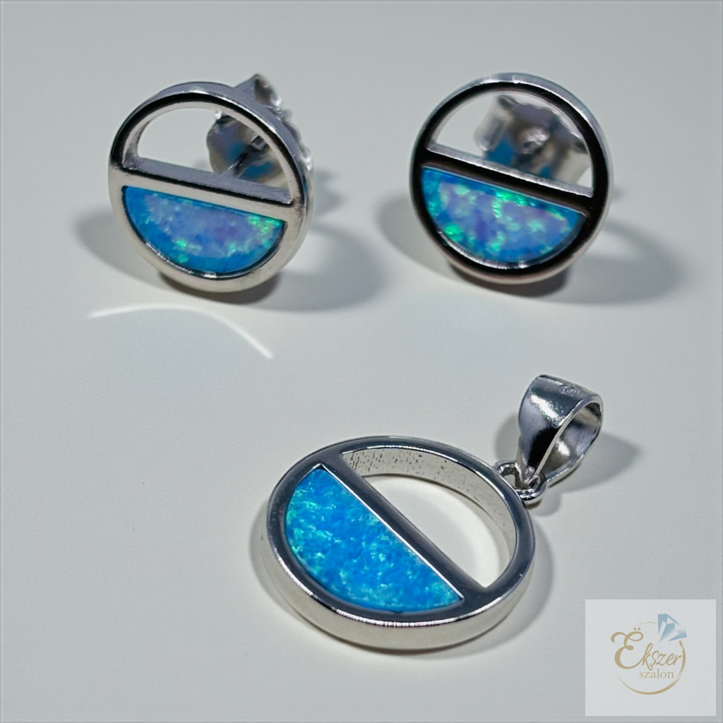 A KÖR formájú fülbevaló és medál különleges megjelenését az adja, hogy a felület fele polírozott ezüst, másik fele pedig ragyogó világoskék szintetikus opál berakás.