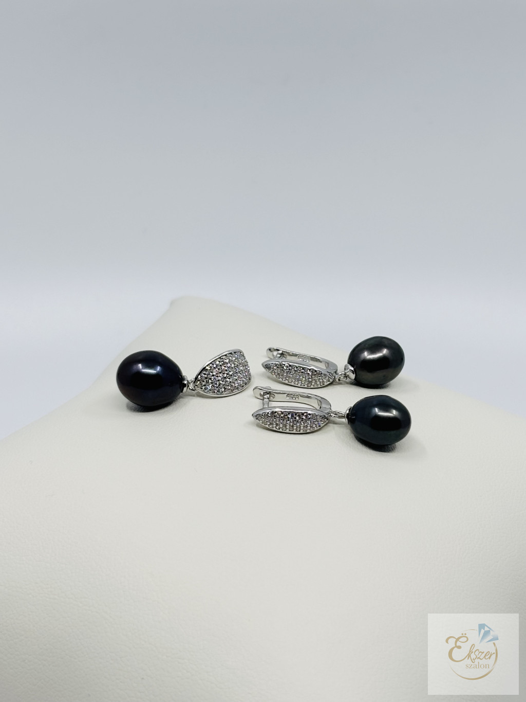A 925 , sterling ezüst alapot ragyogó cirkónia kövek és különleges ovális formájú fekete édesvízi igazgyöngyök díszítik, amelyek mély, gyöngyházfényű csillogásukkal igazán egyedi megjelenést biztosítanak.